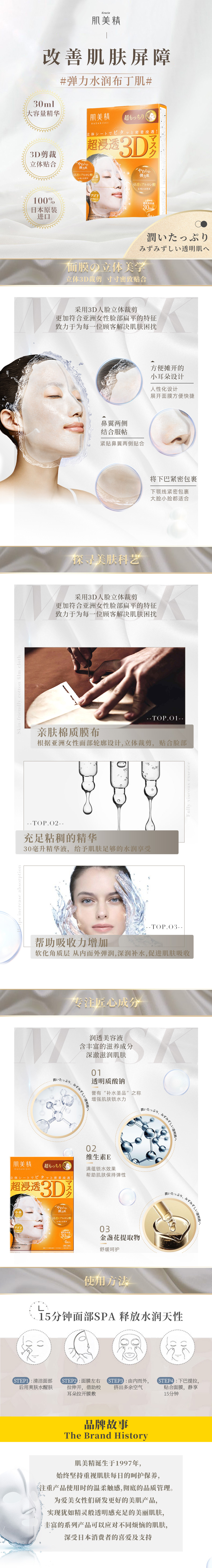 以能夠緊密貼合面部形狀的3D立體面膜,及以黏稠濃郁的美容液提升保濕效果的片狀面膜系列。進行超Q嫩護理,打造柔嫩有彈力的肌膚。添加肌美精獨有的“美肌緊致成分Ex(陽桃提取物*1、薏苡提取物、柚子神經酰胺*2、金盞花提取物以及甘油)”(肌膚調理成分)。打造緊致細膩的肌膚,解決肌膚煩惱。